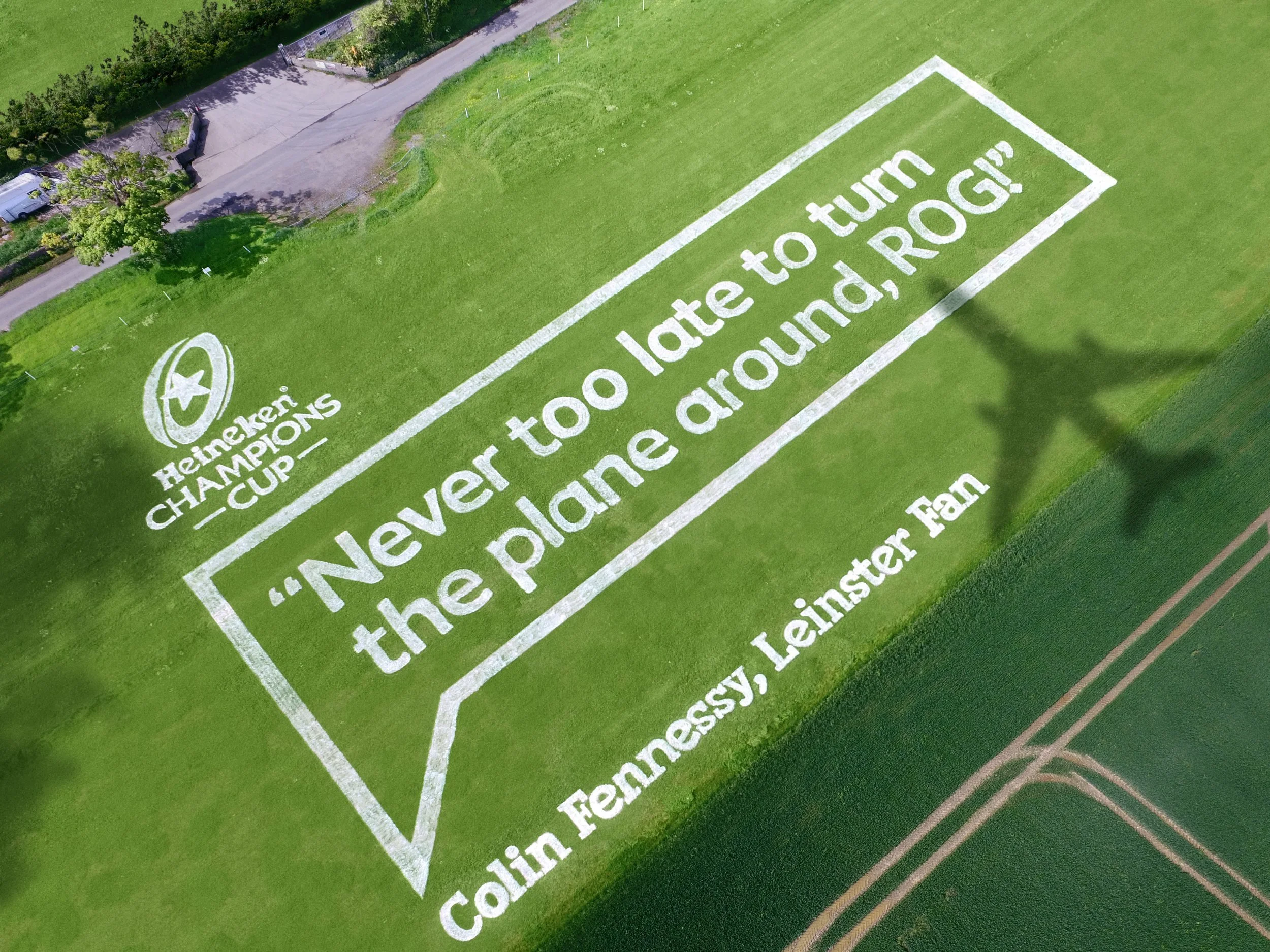 Heineken helped one crazy Leinster rugby fan use an airfield as his canvas to send an enormous provocative message to the most infamous coach in club rugby before the Heineken Champions Cup Final 2023. The Arrivals message was painted directly onto the visiting coach’s flight path at Dublin Airport, Ireland. Applied using eco-friendly pitch-line paint, it measured 30m x 30m - visible from 30,000 feet! It was the first thing head coach ‘ROG’ could see when descending into Dublin.
